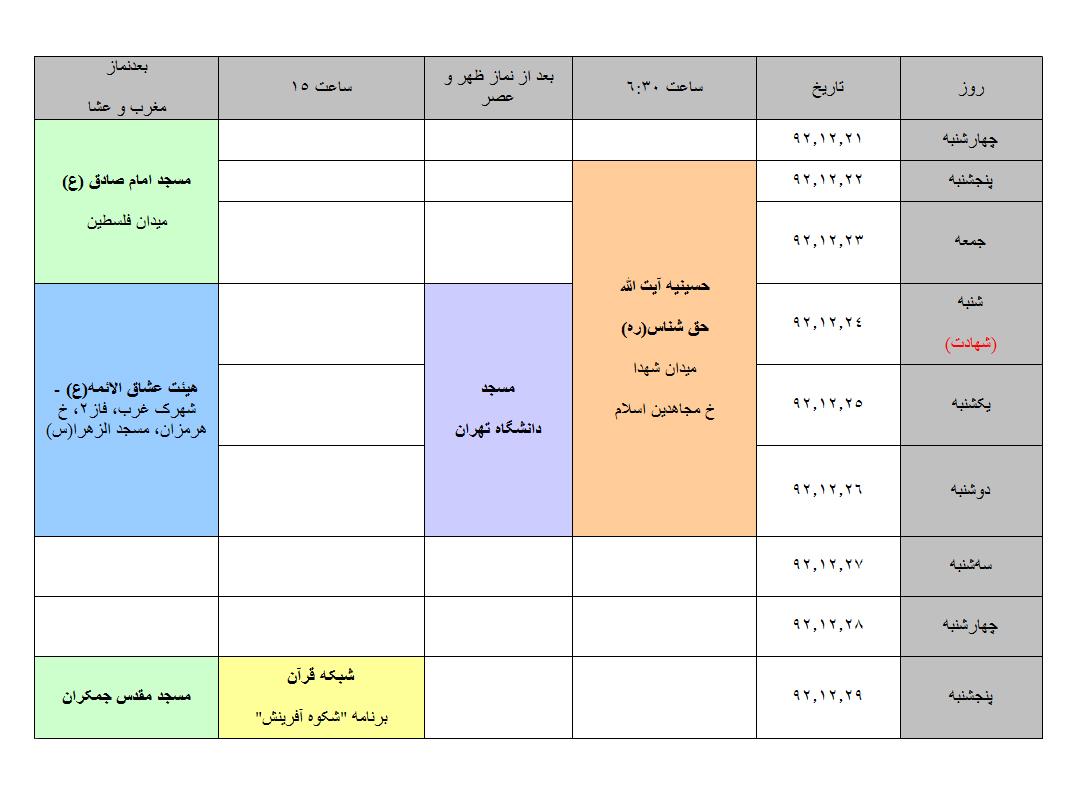 - پنج شنبه | ساعت 21:00 | هیئت هفتگی شهدای گمنام | موضوع: "تاریخ تحلیلی اسلام" (جلسه 23) | خ ولیعصر(ع)، پایین تر از م منیریه، خ فرهنگ، حسینیه شهدای قهرود -یا- خ حافظ، بعد از خ ابوسعید، خ فرهنگ